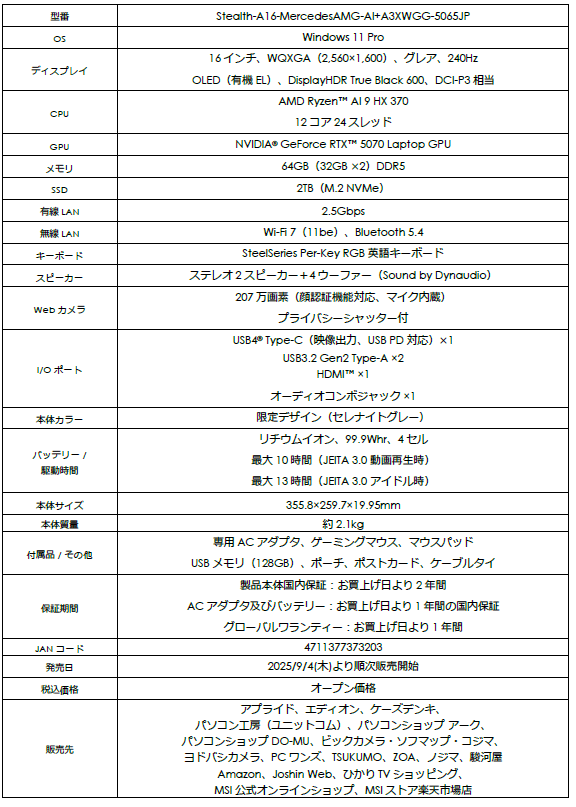 エムエスアイコンピュータージャパン株式会社は、親会社であるMicro-Star International Co., Ltd.と「Mercedes-AMG Motorsport」がコラボレーションし、Copilot+ PCに対応した2025年モデルとして、“Luxury Gaming Experience”を追求して開発した限定デザインゲーミングノートPC「Stealth A16 AI+ Mercedes-AMG Motorsport A3XW」と、“Luxury Driving Productivity”を追求して開発したハイスペックノートPC「Prestige 16 AI+ Mercedes-AMG Motorsport B2VM」を、2025年9月4日(木)より発売いたします。
