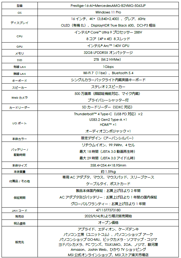 ・Prestige 16 AI+ Mercedes-AMG Motorsport B2VM シリーズ製品ページ:https://jp.msi.com/Business-Productivity/Prestige-16-AI-Plus-Mercedes-AMG-Motorsport-B2VMX