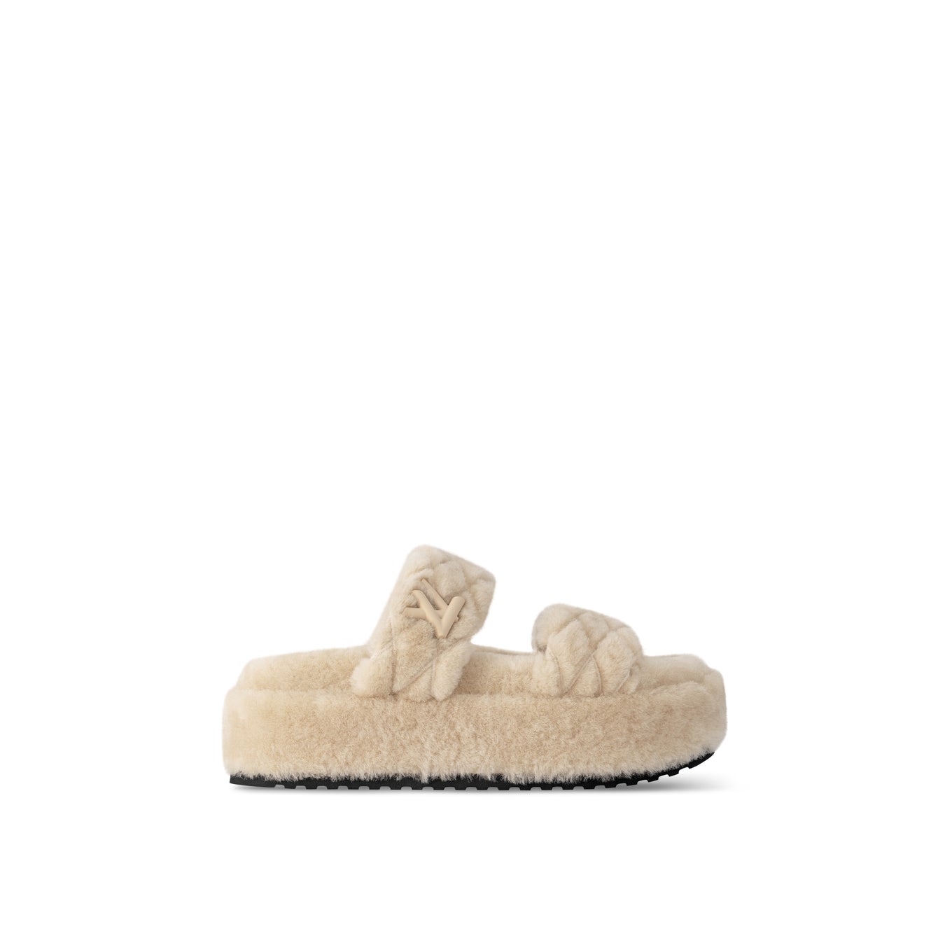 全体をシアリングでカバーし、ふんわりとした見た目と柔らかな肌触りが魅力の「LV サンセット·ライン ミュール」。洗練された雰囲気が際立つ、ルイ·ヴィトンの伝統的なトランクのライニングから着想を得たマルタージュ·パターンをキルティングで施した2本のワイドストラップが特徴です。トーナルなLV ツイストのアクセサリーが個性を添えます。