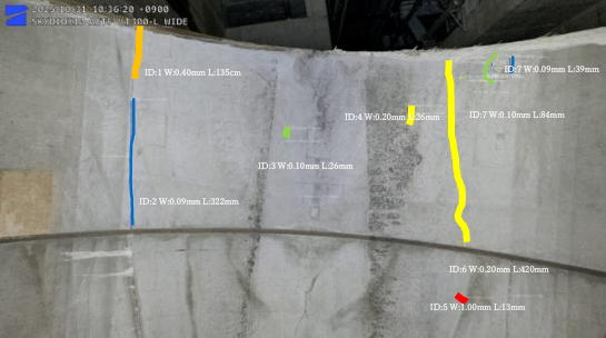 ELIOS 3/Skydio X10で撮影した画像について「eドローンAI」を用いて解析を行った結果、「ひび割れ」を高い精度で検出or軸方向と円周方向に伸びるひび割れを検出することに成功しました。過年度点検調書との比較した場合でも、人の目で確認する場合と遜色ない結果が得られました。これにより、人の目で損傷箇所を発見する労力が低減されます。