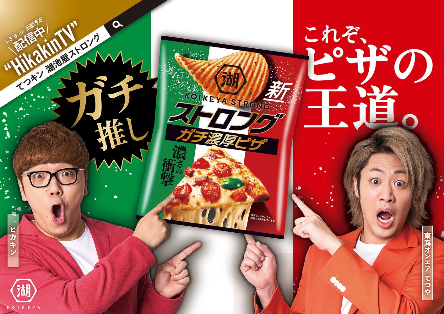 リニューアルした「湖池屋ストロング」を盛り上げる施策として、全世代から圧倒的な支持を得ている、大人気動画クリエイターのヒカキンさんとのコラボレーションが、昨年に引き続き実現しました。さらに今回の動画では、Z世代からの支持率No.1とも言われ、「湖池屋ストロング」好きを以前より公言していただいている、東海オンエアてつやさんにもご出演いただき、「湖池屋ストロング」の新商品“ガチ濃厚ピザ”にかけて、ヒカキンさんとてつやさんが“ガチ対決”する内容となっています。