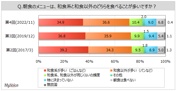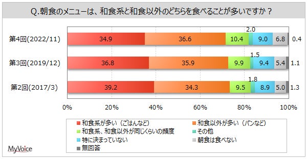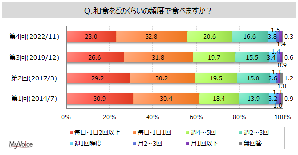 | <今 回>(2022/11)https://myel.myvoice.jp/products/detail.php?product_id=29203 ※上記設問の他に「和食の嗜好度」「和食の準備方法」「和食のおかずを食べる際の重視点」も聞いています。 <第3回>(2019/12)https://myel.myvoice.jp/products/detail.php?product_id=25702 <第2回>(2017/3)https://myel.myvoice.jp/products/detail.php?product_id=22405 |