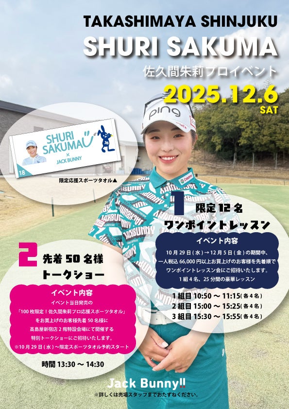 ゴルフアパレル Jack Bunny!! ウエア契約の佐久間朱莉プロが2025年JLPGA国内女子ツアー年間女王に! 12月3日(水)より『祝 佐久間朱莉プロ年間女王おめでとうキャンペーン』を開催。