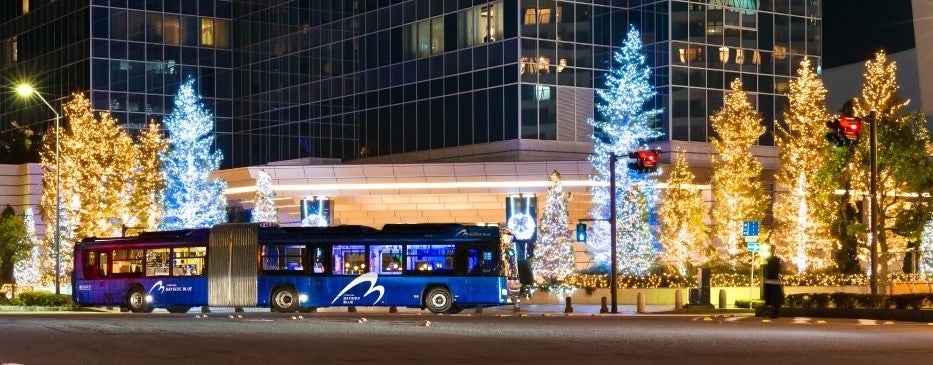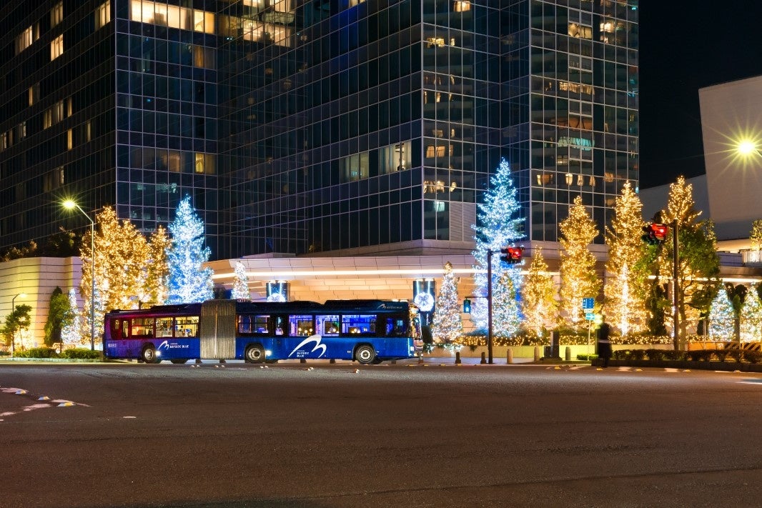 連節バス「BAYSIDE BLUE」3両と「あかいくつ」6両が、特別イルミネーション装飾をして夜