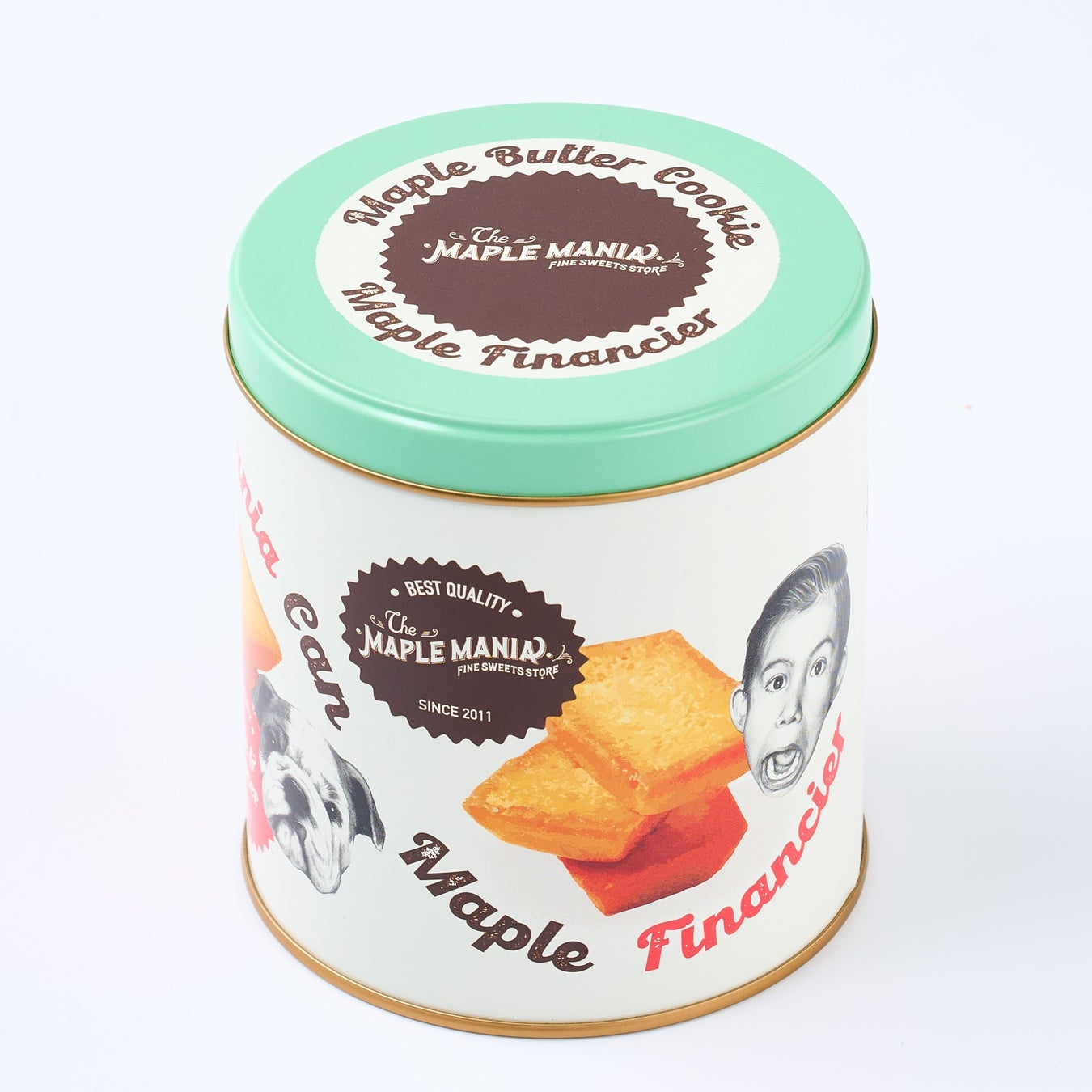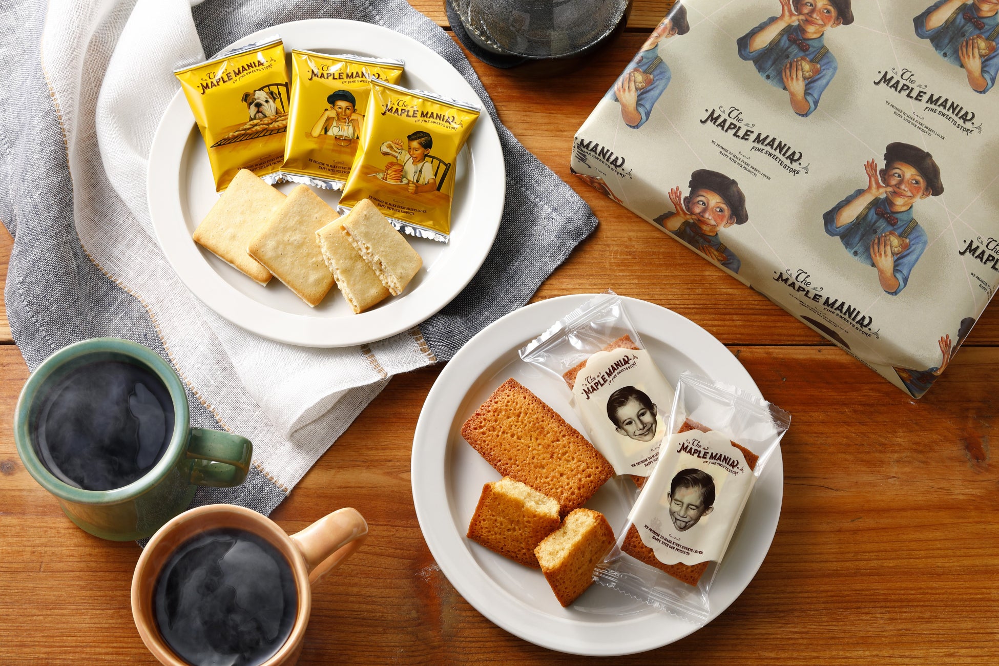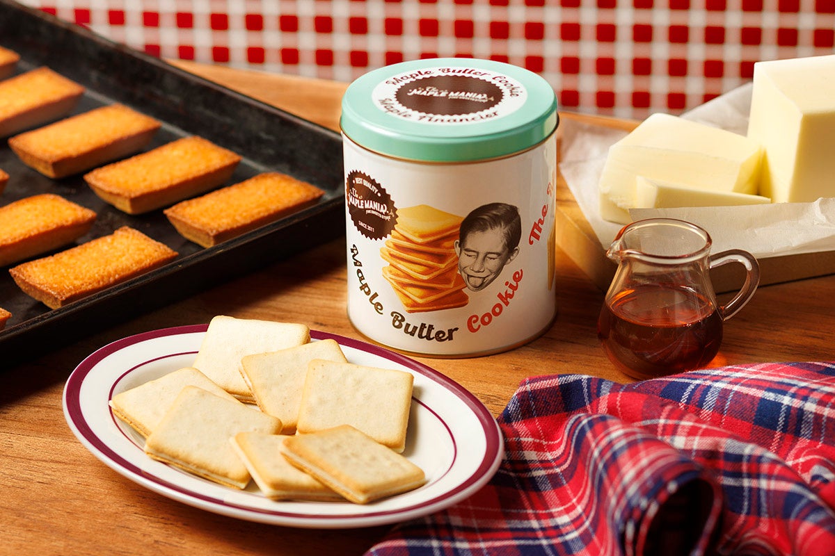 優しい色合いでご用意した今だけのパッケージには、愉快な表情のメープル坊やと愛犬のバディが…。そして、キッチンでお母さんが愛情を込めて作ってくれた、メープルバタークッキーとメープルフィナンシェをイラスト調で描きました。ザ・メープルマニアの世界観あふれる限定缶です。