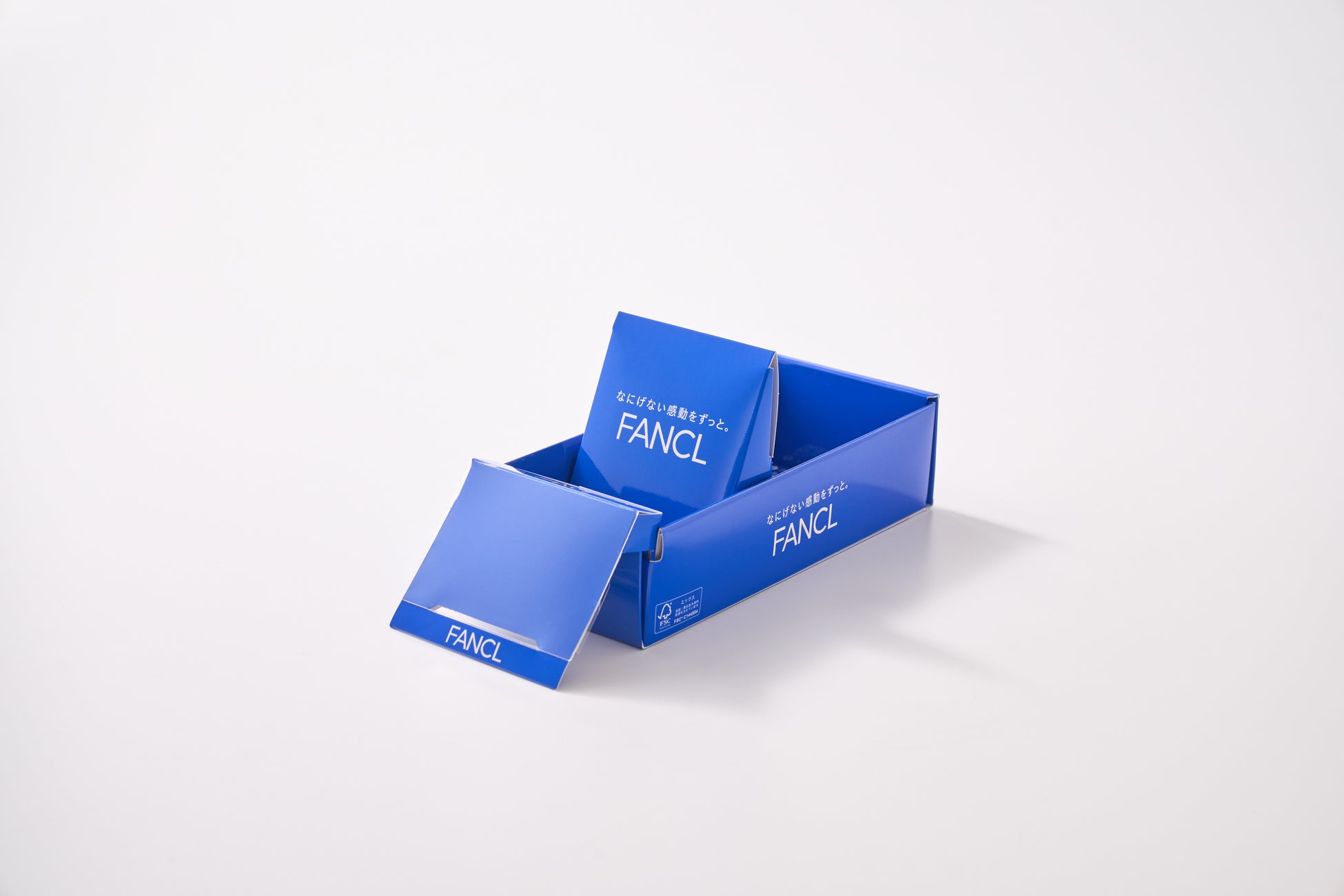 本什器は紙材質ながら高い強度を誇るファンケルオリジナルの什器です。2023年10月から半年間実施したテスト展開においても、耐久性や使い勝手などにおいて高い評価をいただきました。棚への設置のしやすさや掃除・お手入れの容易さなど利便性にも優れています。