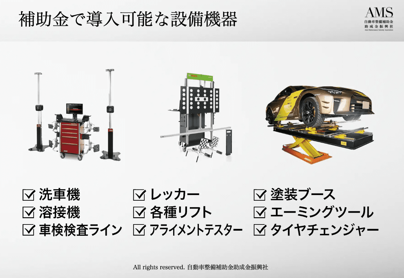 対象機種:エーミング機器、アライメントテスター、塗装ブース、リフト、フレーム修正機・測定器、レッカー、洗車機、車検検査ライン、タイヤチェンジャー、その他各種自動車整備機器、等