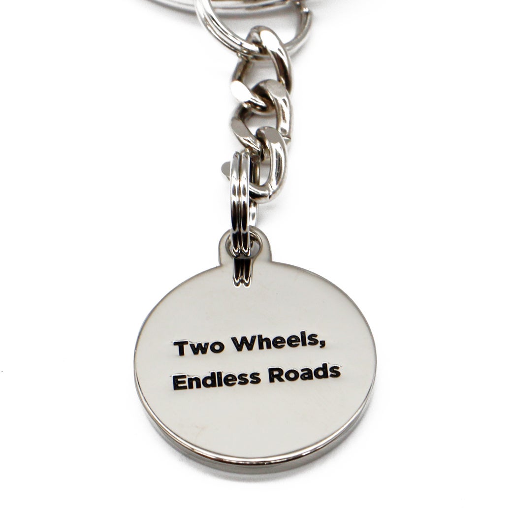 Hondaのウイングマークチャームの裏面には「Two Wheels, Endless Roads」の文字が刻まれています。