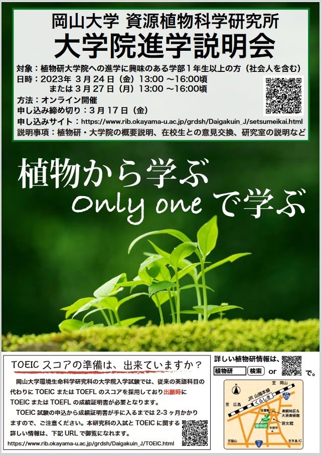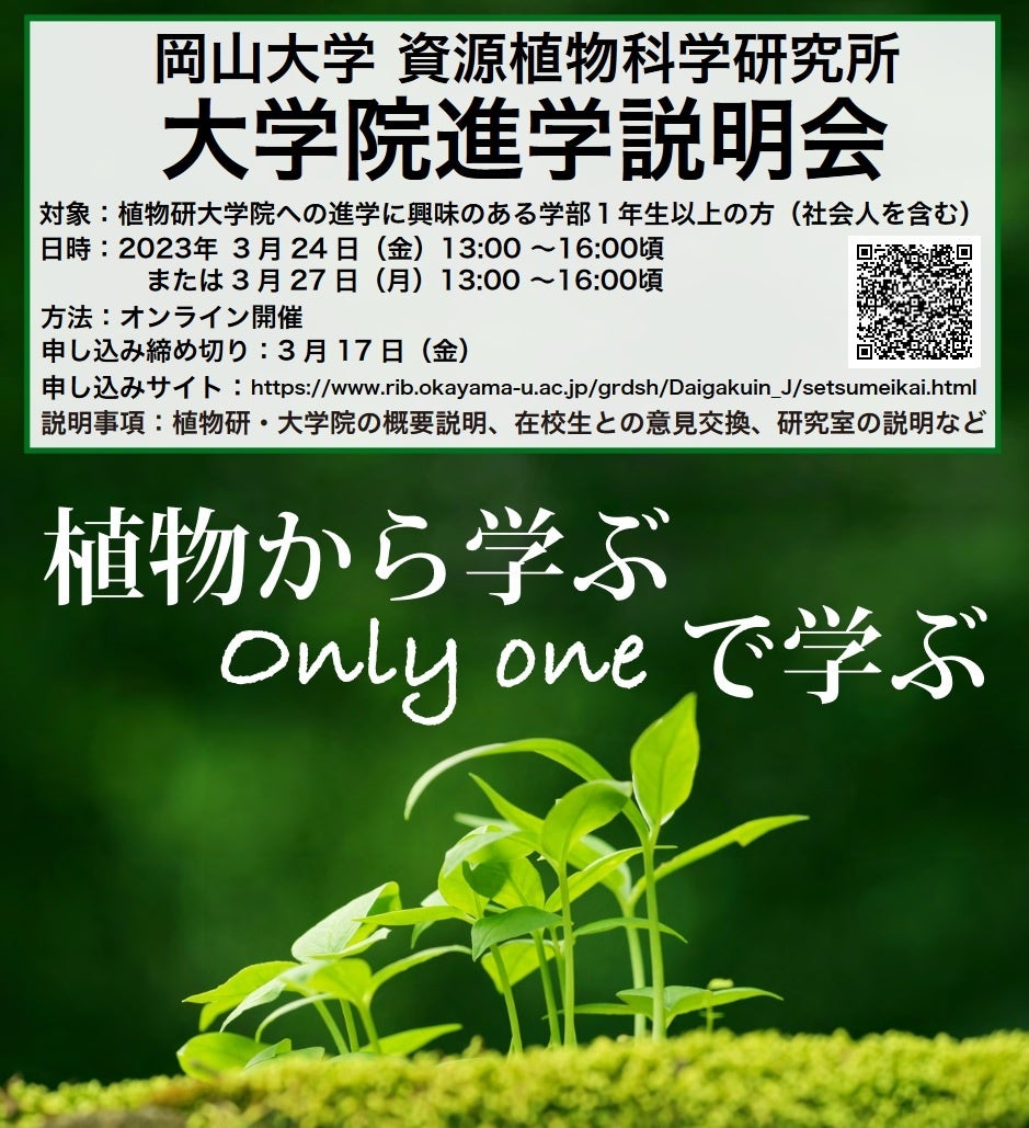 国立大学法人岡山大学(本部:岡山市北区、学長:槇野博史)の資源植物科学研究所(倉敷市中央)では大学院進学を検討されている皆様を対象に、オンライン大学院説明会を2023年3月24日(金)、27日(月)に開催します。