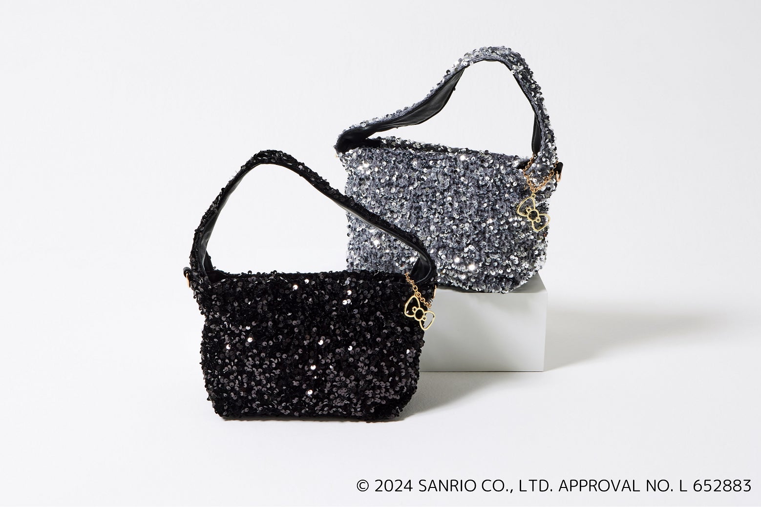トレンドのスパンコールをたっぷりあしらったショルダーバッグ。ハンドルに付けたリボンチャームがさりげないワンポイントになっています。