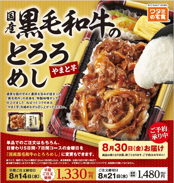 「ワタミの宅食」では季節や行事を感じていただけるよう、数量限定で特別弁当の販売を行っており、2024年度は月替わりでの販売を予定しております。今回販売しております「国産黒毛和牛のとろろめし」は、8月30日(金)にお届けをします。