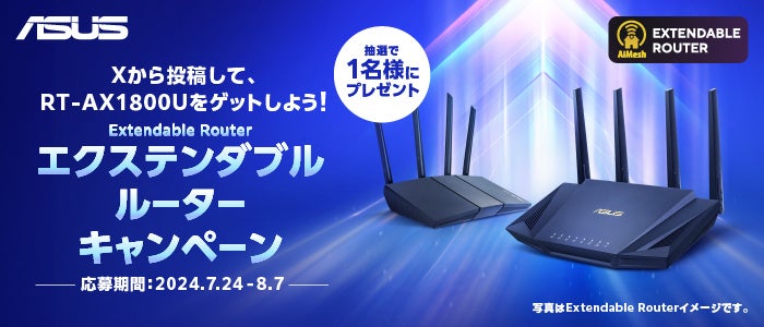 ASUS JAPAN株式会社は、RT-AX1800Uが1名様に当たるExtendable Router X(旧Twitter)キャンペーンの開催を発表しました。