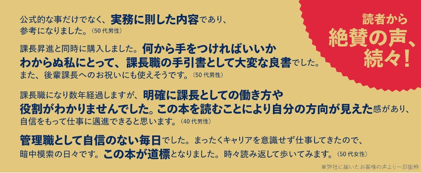 また、本書への反響をきっかけに、全国の企業で本書を元にした企業研修が行なわれるようになり、書店店頭には「課長本ジャンル」ができるほど、充実するようになりました。類書がたくさんある現在でも、本書は「新任マネジャーのバイブル的テキスト」としてご活用いただいています。
