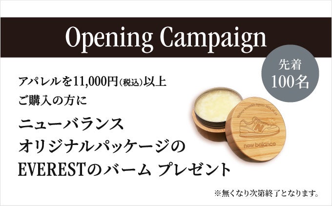 グランドオープンを記念し、特別先行発売商品やmyNB会員様向けのオープニングキャンペーンをご用意しています。店内アパレル商品を11,000円(税込)以上ご購入の先着100名様に、“EVEREST”のバームを、ニューバランスオリジナルパッケージでプレゼントいたします。