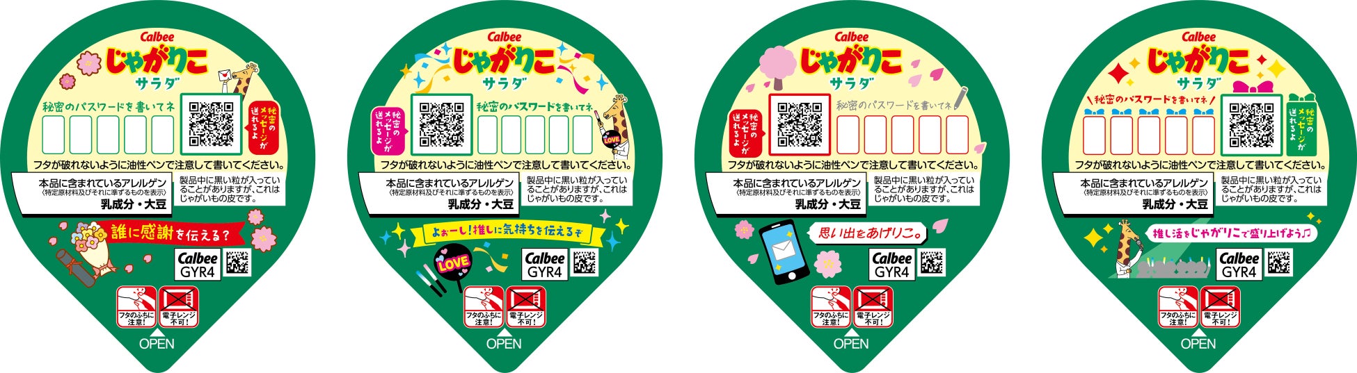 『じゃがりこ秘密のメッセージ』のリリースに合わせて、2024年2月中旬より順次、「じゃがりこ」のフタにパスワードを書き込める期間限定デザインを展開します。フタのデザインは全部で4種類です。