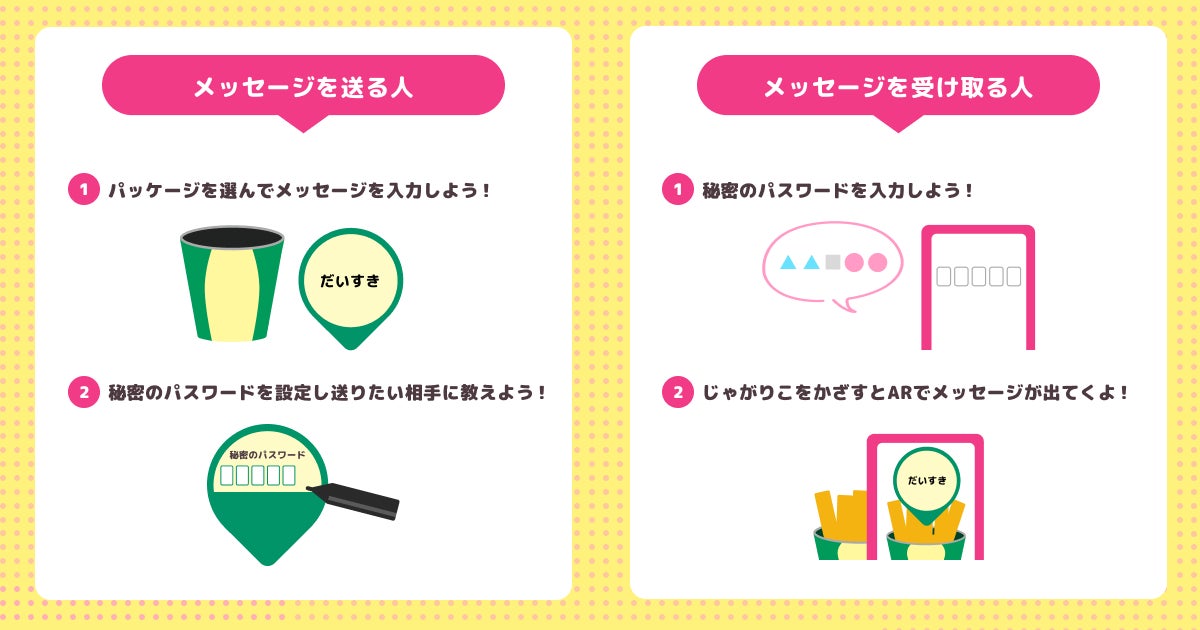 “メッセージを送る人”は、専用サイトでメッセージと演出フィルターを登録。ランダムで発番されるパスワードを「じゃがりこ」に書き込み、メッセージを送りたい相手に「あげりこ」します。“メッセージを受け取る人”が「じゃがりこ」に書かれたパスワードを専用サイトに入力すると、画面上にARフィルターが立ち上がります。ARフィルターに表示される枠に合わせて「じゃがりこ」をかざすと、画面上に3Dの「ARじゃがりこ」とメッセージが出現します。