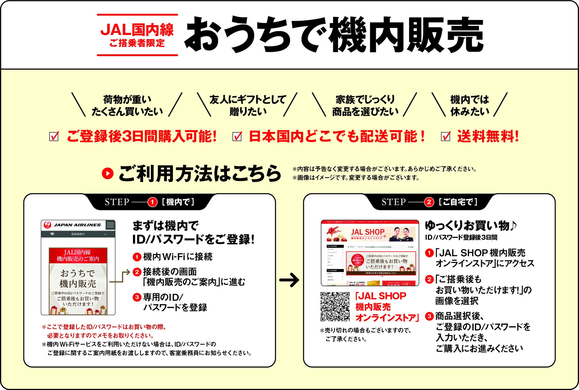 おうちで機内販売とは、JAL国内線にご搭乗の際に、機内Wi-Fiを利用して事前登録いただくと、