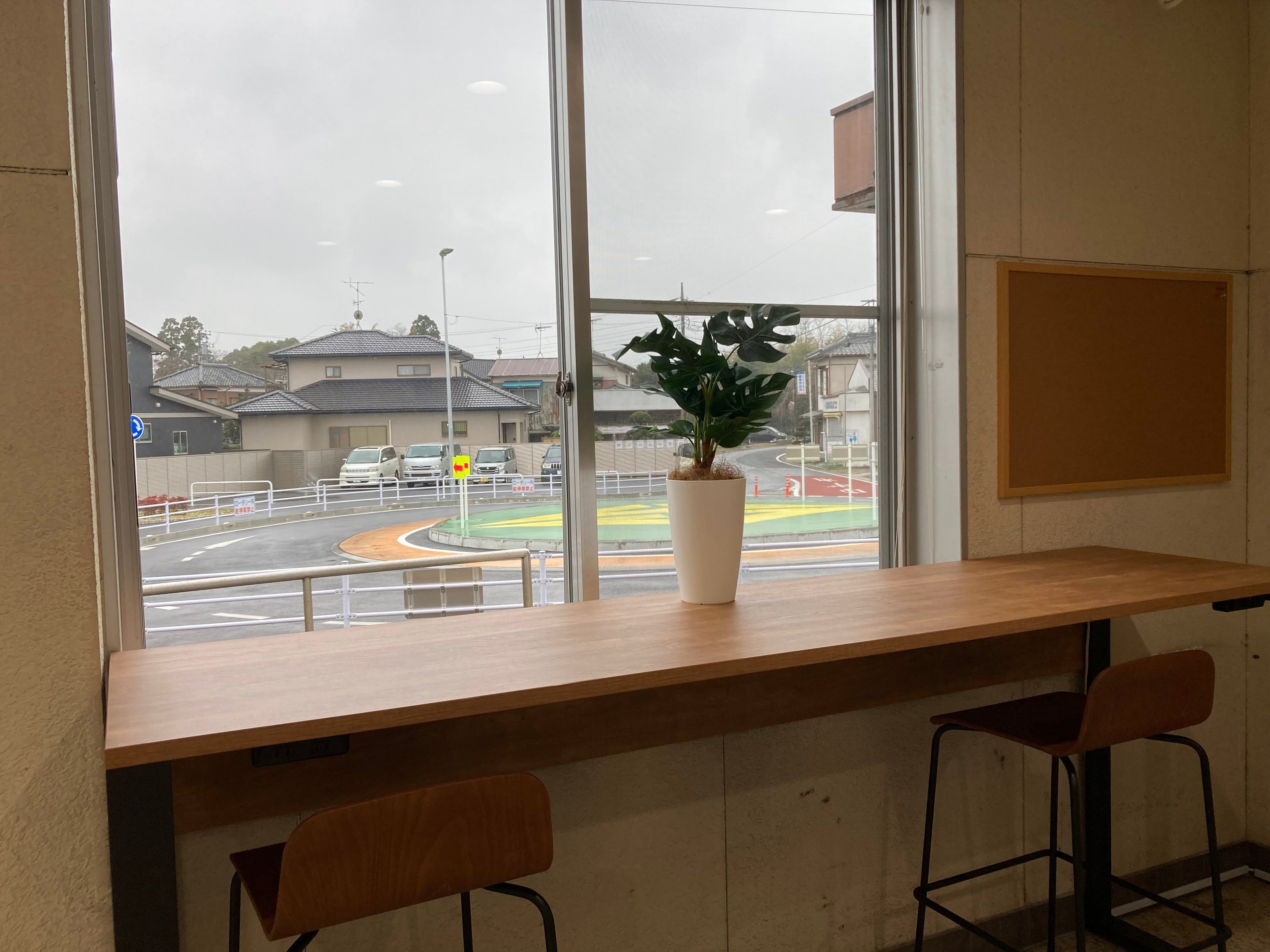 電源付きのカウンターとハイチェアを窓際に配置した2人分のコワーキングスペースです。