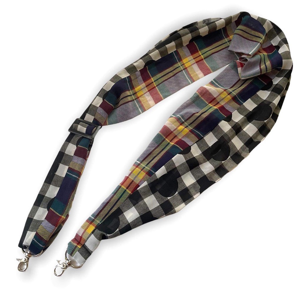 スカーフ状の二点吊りのストラップです。長さが2倍に可変するのでネックストラップから斜めがけストラップに変えることができます。いろいろな長さにできるのでスマホストラップや、カメラのショートストラップ、ウエストベルト等多様に使用できます。