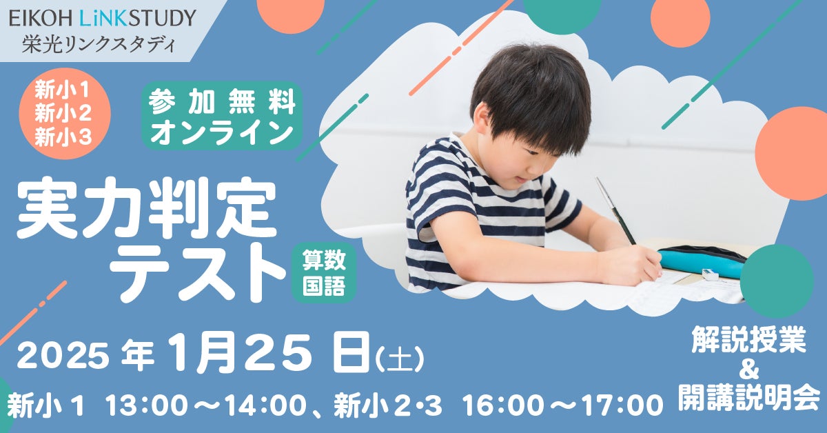 株式会社増進会ホールディングス(Z会グループ)のグループ会社、株式会社栄光(本社:東京都千代田区 代表取締役社長:下田勝昭)が運営するオンライン進学塾「EIKOH LiNKSTUDY(栄光リンクスタディ)」は、新小学1・2・3年生(現年長・小学1・2年生)対象の「オンライン実力判定テスト」を実施します。また、テストのオンライン解説授業と新年度開講説明会を、2025年1月25日(土)に行います。