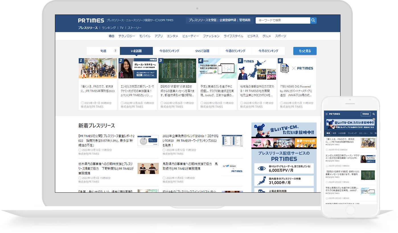PR TIMES(読み:ピーアールタイムズ)は、「行動者発の情報が、人の心を揺さぶる時代へ」をミッションに掲げ、企業とメディア、そして生活者をニュースでつなぐインターネットサービス「PR TIMES」 を2007年4月より運営しています。報道機関向けの発表資料(プレスリリース)をメディア記者向けに配信するとともに、「PR TIMES」およびパートナーメディアに掲載し、生活者にも閲覧・シェアされています。利用企業数は2022年11月に7万6000社を突破 、国内上場企業52%超 に利用いただいています。情報収集のため会員登録いただくメディア記者2万4000人超 、サイトアクセス数は月間6600万PV を突破、配信プレスリリース件数は累計100万件 を超えています。全国紙WEBサイト等含むパートナーメディア220媒体以上 にコンテンツを掲載しています。