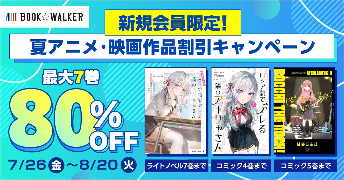 株式会社ブックウォーカー(本社:東京都千代田区 代表取締役社長:森田岳)は、総合電子書籍ストアBOOK☆WALKER(以下、BOOK☆WALKER)にて2024年7月26日(金)0時より、夏アニメ・映画作品の人気書籍が最大7巻まで80%オフになるお得な割引キャンペーンを開催します。