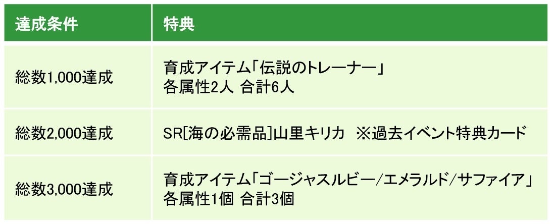 総数3,000達成 | 育成アイテム「ゴージャスルビー/エメラルド/サファイア」 各属性1個 合計3個 |