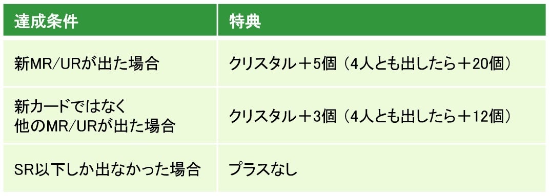 新カードではなく 他のMR/URが出た場合 | クリスタル+3個 (4人とも出したら+12個) |