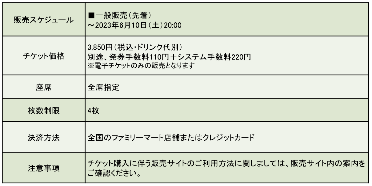 チケット価格 | 3,850円(税込・ドリンク代別) 別途、発券手数料110円+システム手数料220円 ※電子チケットのみの販売となります |