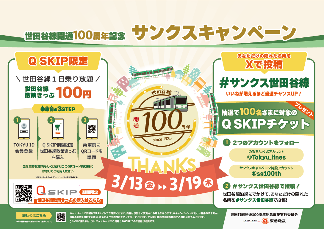 「Q SKIP」の企画乗車券をプレゼントする企画も合わせて実施します。参加方法は、Xで東急電鉄公式アカウントと本キャンペーン特設アカウントをフォローしていただき、「#サンクス世田谷線」のハッシュタグを付けて世田谷線沿線のおすすめスポットの写真を投稿していただくと本企画に参加となります。