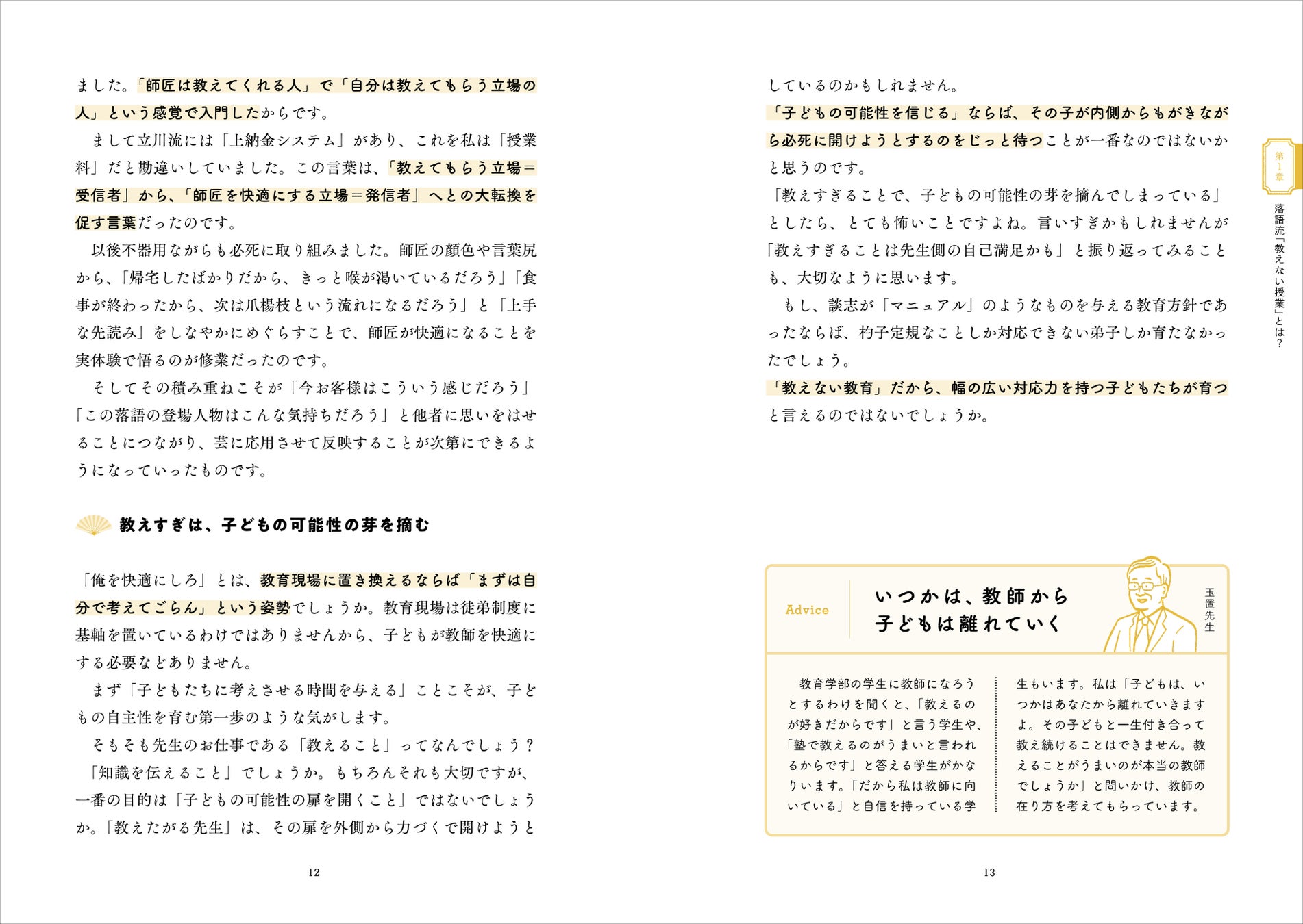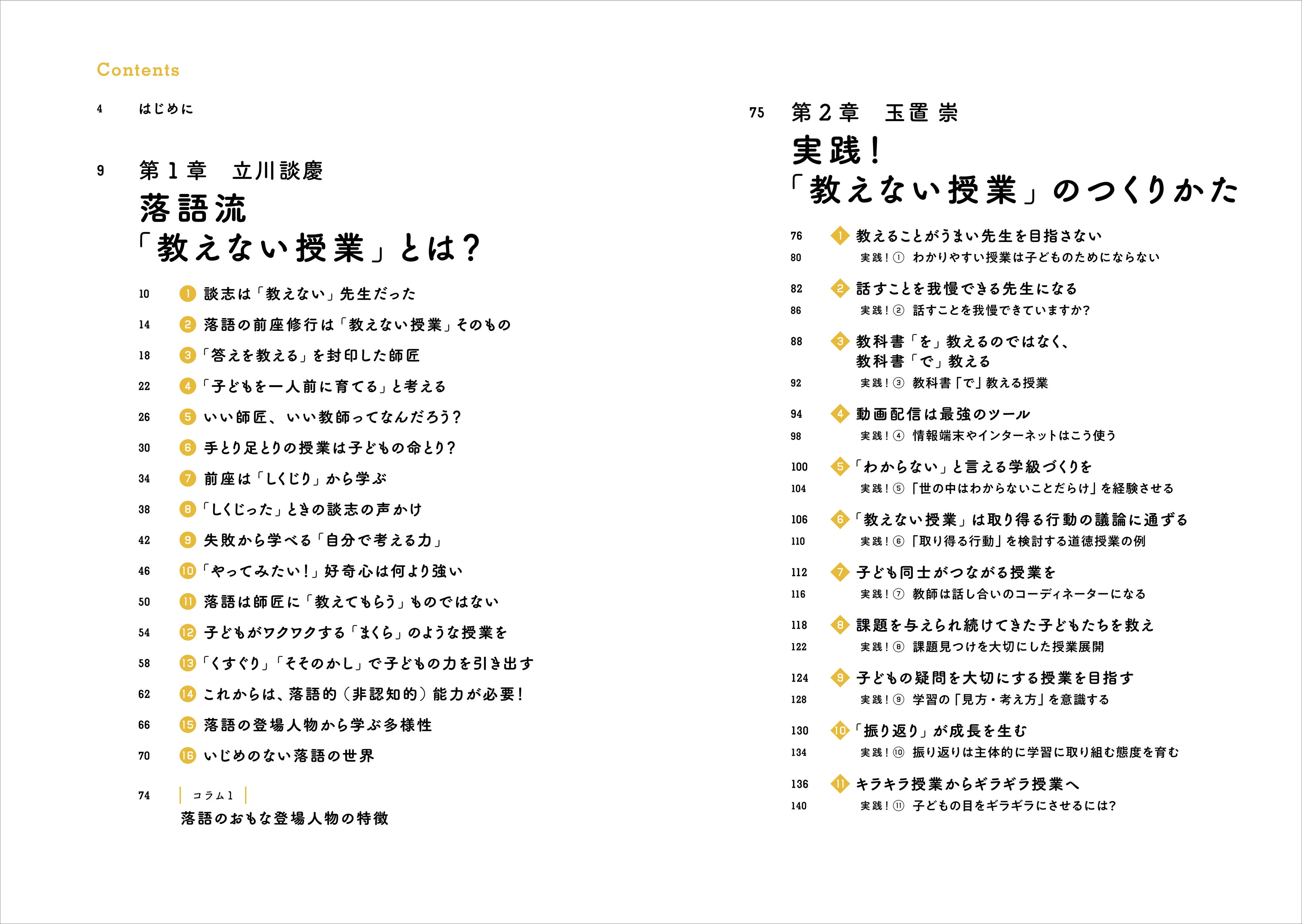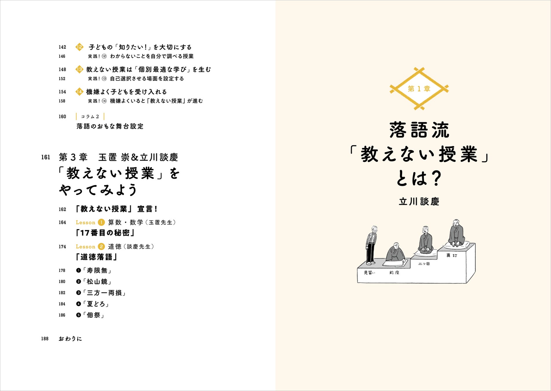 そこで本書では、マニュアルや答えがなく、自分で考え行動しなければならない落語家の前座修行からヒントを得て、「教えない授業」に展開する具体的な方法を紹介。