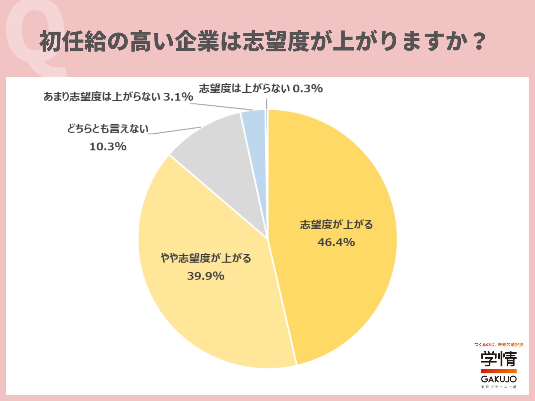 初任給が高い企業は、「志望度が上がる」と回答した学生が46.4%に上りました。「やや志望度が上がる」39.9%を合わせると、9割に迫る学生が初任給の高い企業は「志望度が上がる」としています。「初任給が高いと、賞与や昇給の幅も大きいのではと期待が持てる」「物価が高騰しているため、少しでも高い方が良い」「労働条件や業務内容に大きな差がなければ、初任給が高い企業を希望する」といった声が寄せられています。