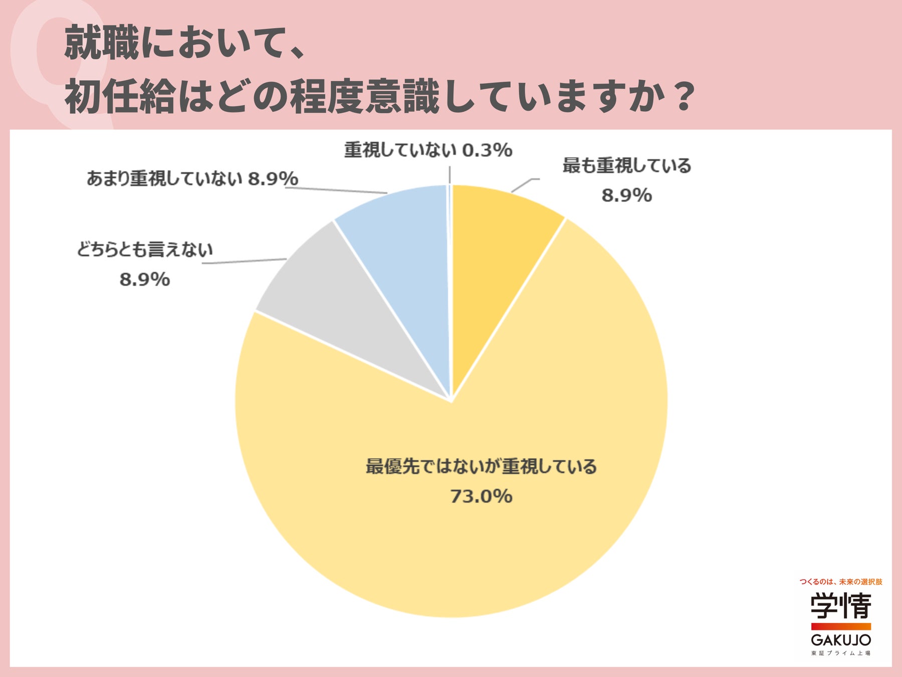 就職において、初任給をどの程度意識しているかについて、「最優先ではないが重視している」と回答した学生が、73.0%で最多となりました。「最も重視している」8.9%を合わせると、「重視する」とした学生は8割を超える結果となっています。「自分のキャリアのベースとなる給料なので、重視している」といった声の他、「初任給以上に、その後の昇給イメージが重要だと考えている」「初任給だけではなく、仕事内容や福利厚生、社内の雰囲気など様々な要素を見て総合的に判断したい」といった声も寄せられました。