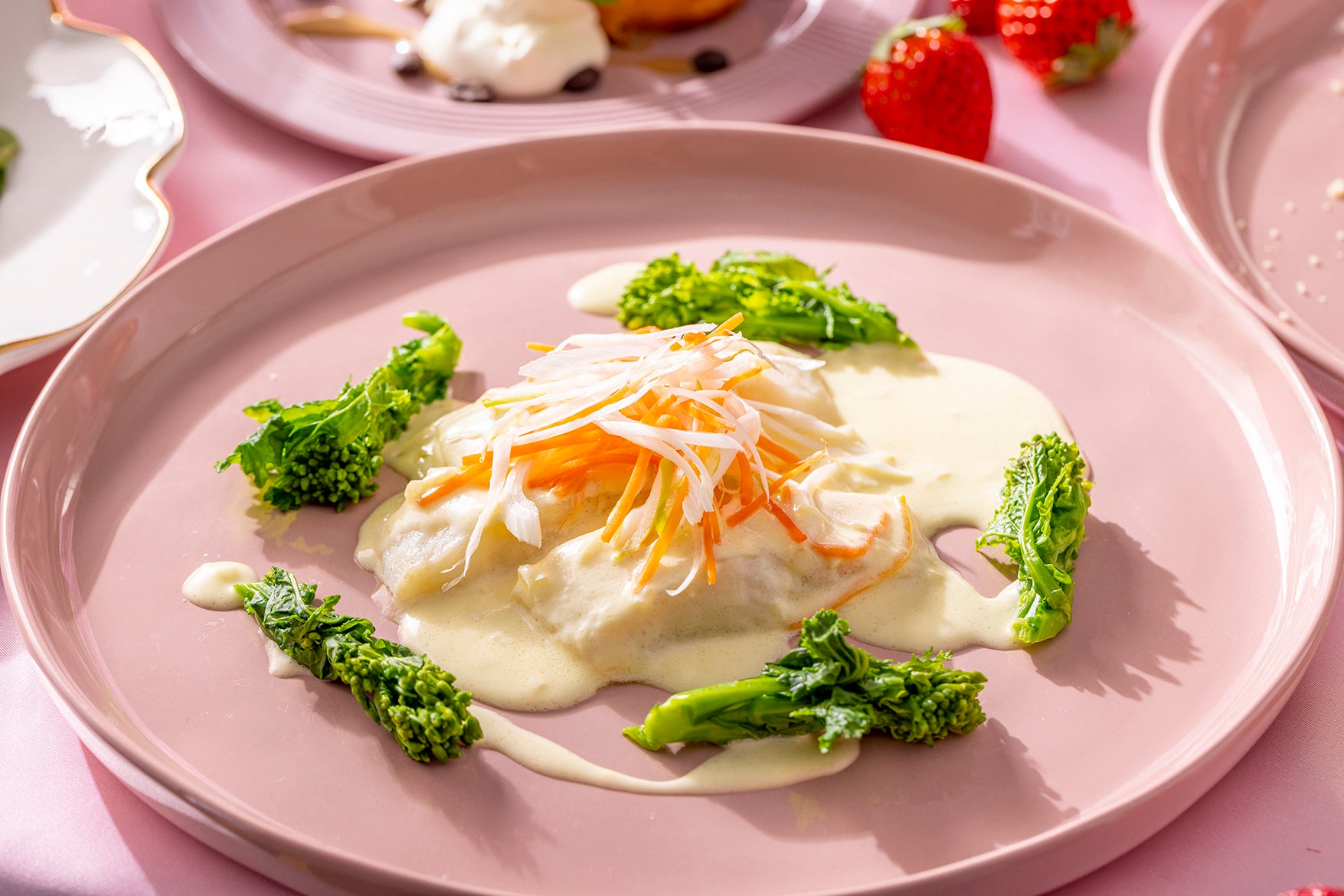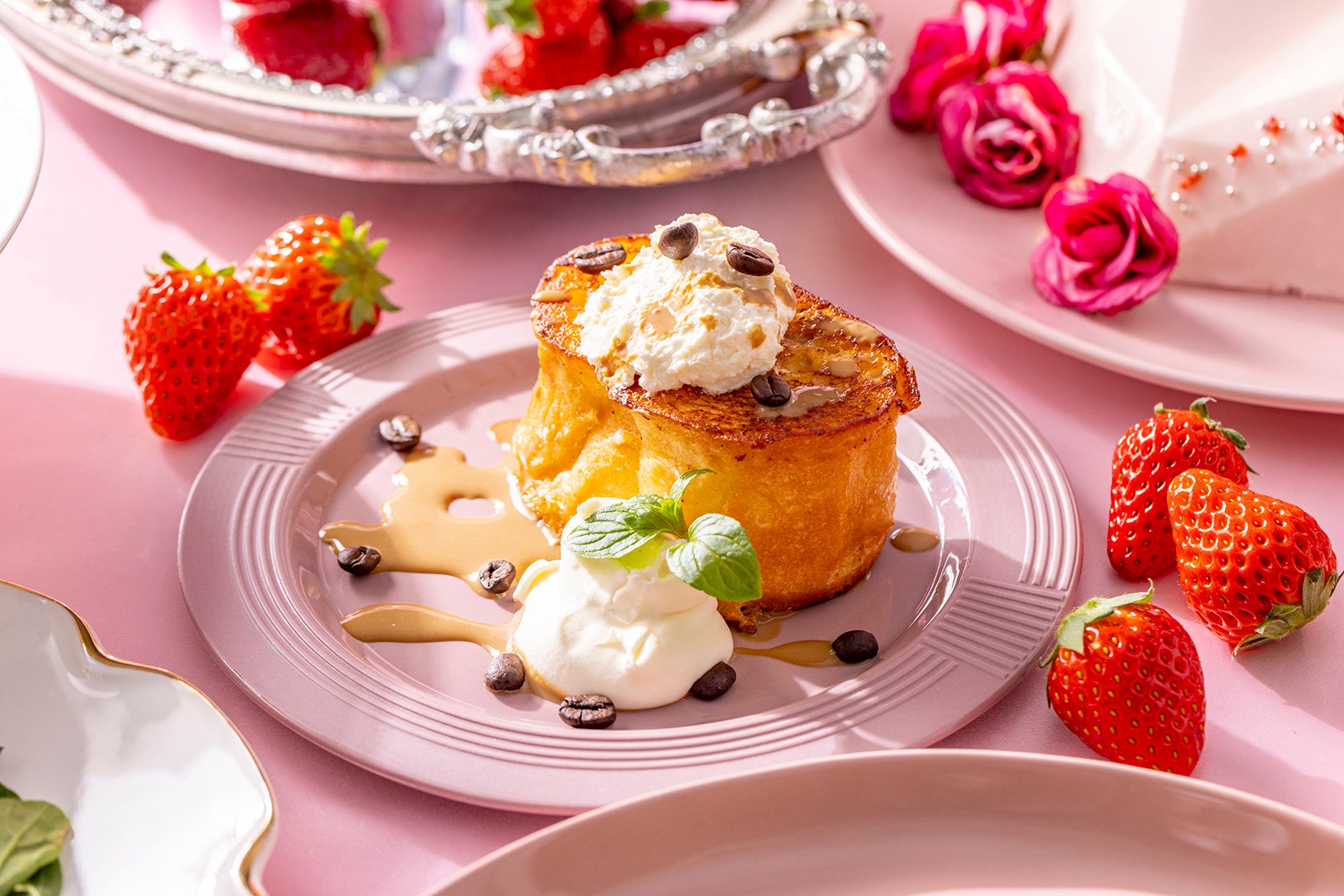 ホワイトチョコでコーティングをしたいちごをのせた「いちごのショートケーキ」、表面がつやつやと輝く「いちごとホワイトチョコレートのミラーケーキ」、ピンク色をしたモンブランに薔薇飾りをまとった「ラズベリーモンブラン、ローズとフロマージュのムース」、クラッカーにマシュマロのようなフワフワ感あるギモーヴをサンドした「いちごのギモーヴサンド」、薔薇のシロップを加えたゼリーの中にいちごを浮かべた「ローズと杏仁のゼリー」など全8種類の日替わりデザートをお楽しみいただけます。また長さ40㌢のバゲットを8等分にカットし、丸1日卵液に漬け込んだフレンチトーストは1日に150~200個オーダーが入る人気メニューです。鉄板で卵液が染み出さないよう、表面はカリッと、中はプリンのようなプルプル感を意識して焼き上げています。コーヒー風味に仕上げたエスプレッソアングレーズソースを添えてお召し上がりください。お料理は、桜えびや新玉ねぎ、アサリ、菜の花など柔らかくてみずみずしい春の食材を使って、フレンチとイタリアン両方を体験することができるお料理に仕上げています。この時期ならではの絶品を揃えた春のビュッフェをご堪能ください。