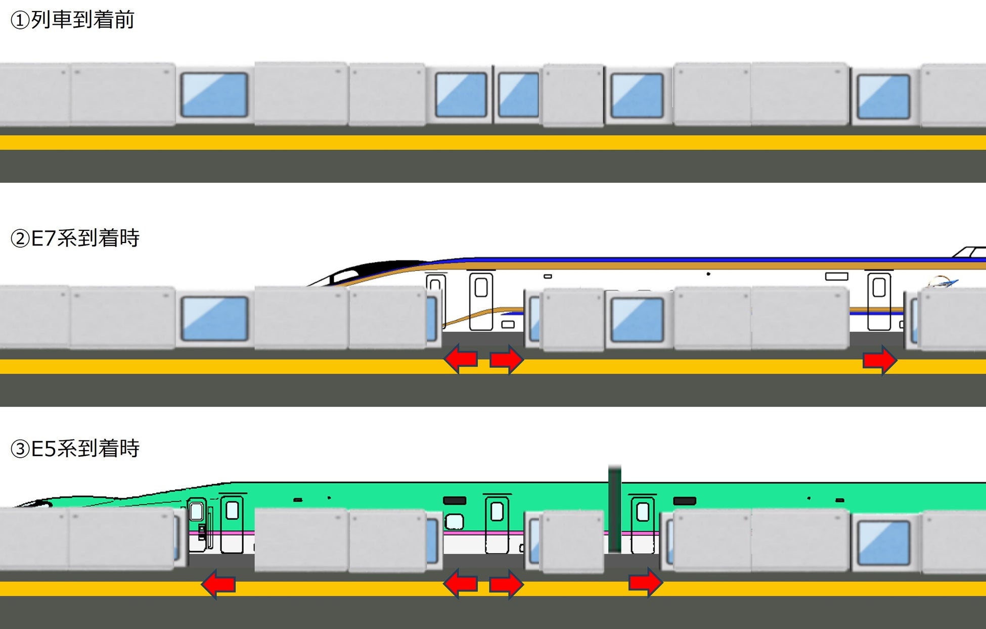 ・ 車両ドアの位置が異なる新幹線の編成※1に対応したレイアウトのホームドアを設置します。【図1】