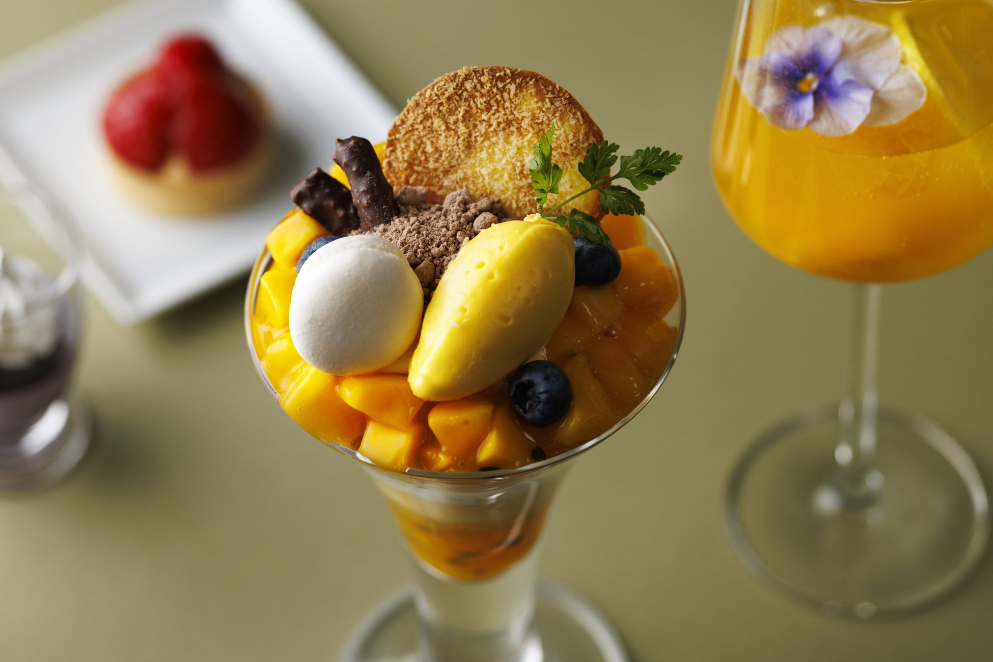 国産マンゴーとメキシコマンゴーの2種類のマンゴーを使うことで、奥ゆきのある味わいに。一口食べればそこはまるで南国!マンゴーとココナッツのハーモニーが、リゾート気分に誘います。5層ものレイヤードは、イエローカラーのフォトジェニックな美しさ。マンゴーパッションフルーツジュレやマンゴームース、ココナッツブランマンジェなど、ひとつひとつの美味しさはもちろん、グラスの下までいっきにスプーンですくって一度に頬張ると、それぞれの美味しさが重なり合う、味わいの調和もお楽しみいただけます。