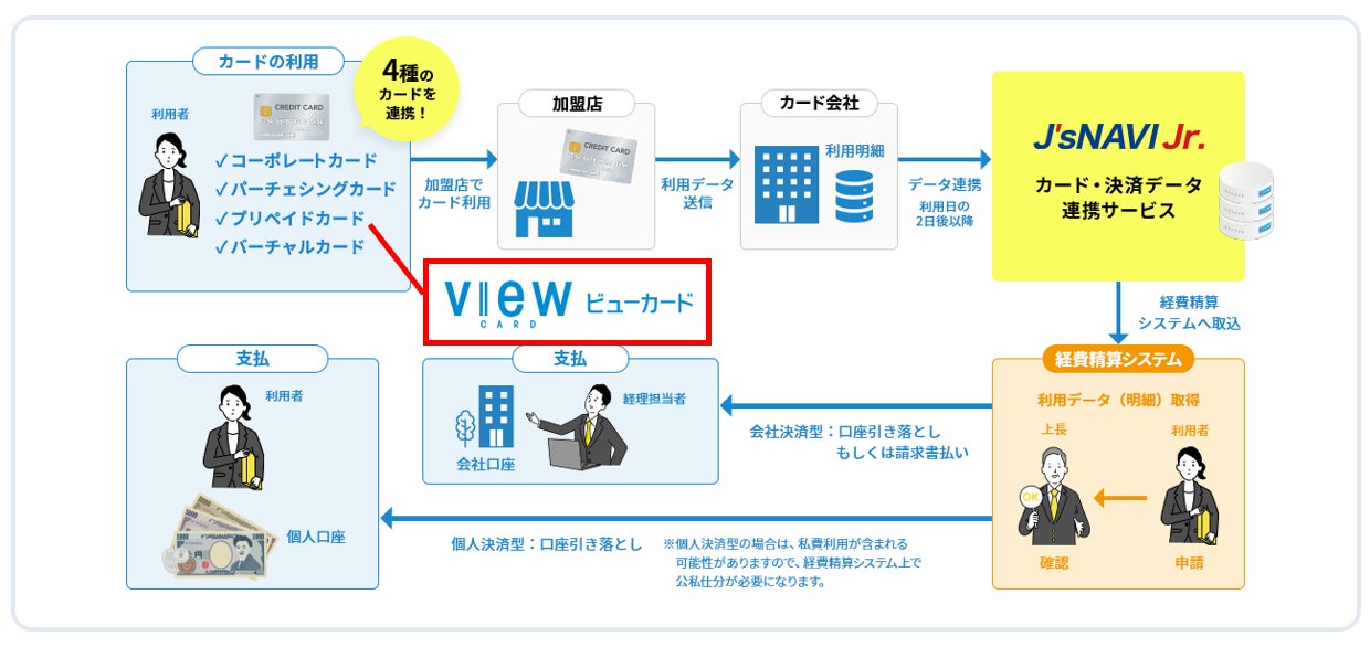 今回、ビューカードとの提携により、同社が発行する VISA ブランドの「ビューコーポレートカード」、「ビュー 法人カードレスサービス」 の利用明細データを、「J’sNAVI Jr.」を経由して、同カードの導入企業が利用中のワークフロー・ 経費精算システムに連携することが可能となります。また、電 子帳簿保存法に適合したクラウド型経費精算システム「J’sNAVI NEO(ジェイズナビネオ)」 であれば、「ビューコーポレートカード」の利用明細 データを改ざん・改変せずに保持し、精算処理後のデータの検索・閲覧・出力も可能となり、電子帳簿保存法に則した上で、更なる経費精算業務の効率化が実現します。本サービスはユーシーカード株式会社を経由して提供されるサービスです。今回の連携開発により、「J’sNAVI Jr.」はユーシーカードのVISAブランドコーポレートカードとも連携可能になりました。