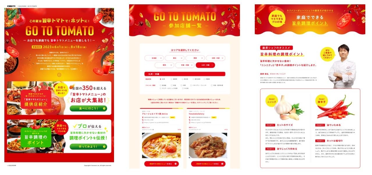 特設サイトでは、全国の「旨辛トマト」メニュー・ドリンクを提供する約350店の飲食店が検索できるほか、自宅でも「旨辛トマト」を楽しんでいただけるよう、プロによる旨辛料理の調理ポイントやおすすめ商品・レシピなどもご紹介します。また、フェア期間中カゴメ公式SNSアカウントなどで、情報発信をしてまいります。