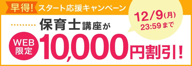 株式会社ユーキャンでは、2024年11月21日(木)よりWEB限定キャンペーンを開始しました。2024年12月9日(月)まで、WEBからの受講限定で保育士講座の受講料を10,000円割引いたします。