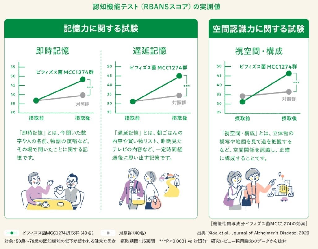 概要:『RBANS』による評価では、ビフィズス菌MCC1274の摂取により、プラセボ摂取群と比較し
