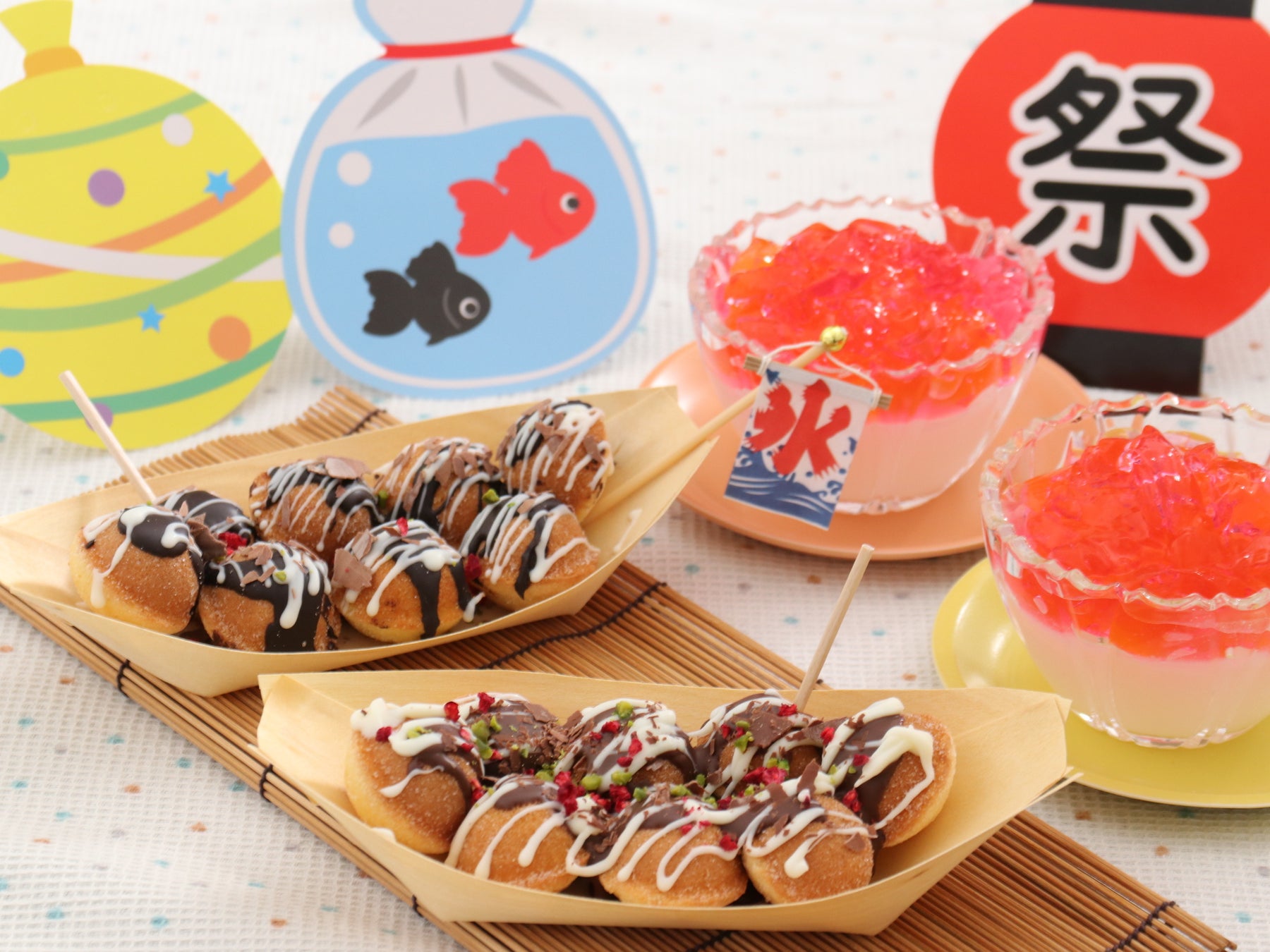 お祭りの屋台の人気メニュー「たこ焼き」と「かき氷」をかわいいスイーツにアレンジしました。お子さまでも簡単に作れるミニカステラは、まるでたこ焼きのように可愛らしいフォルム。舟皿に入れて持ち帰れば、お家でもお祭りのワクワク感を楽しめます。かき氷風ゼリーは、フルーツをたっぷり入れたなつかしい味わいです。楽しい夏の思い出を一緒に作りましょう!