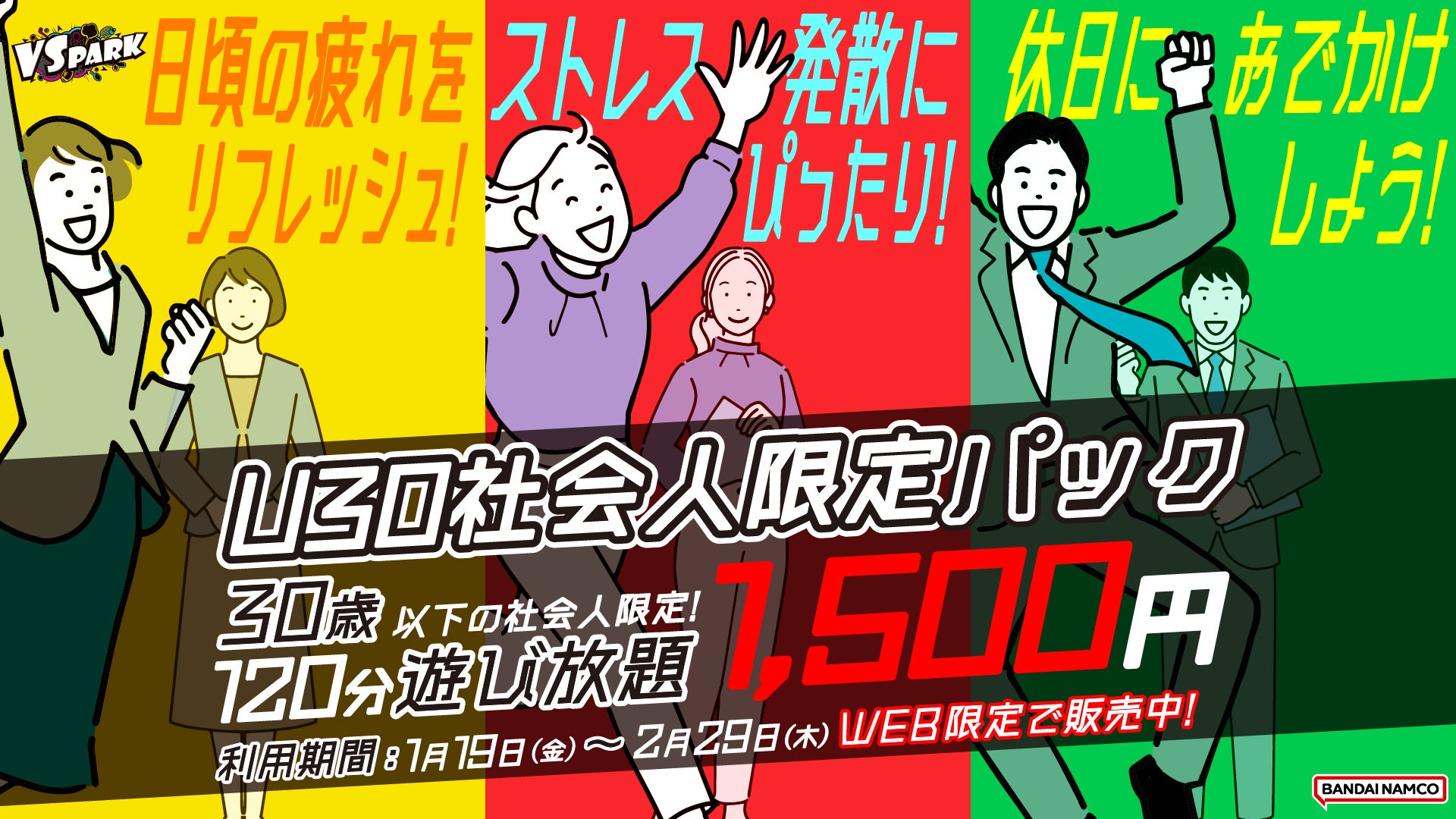「VS PARK U30社会人限定パック」は30歳までの社会人の方限定の120分1,500円で遊べるお得な料金パックです。利用にはWEBからの事前購入が必要です。※
