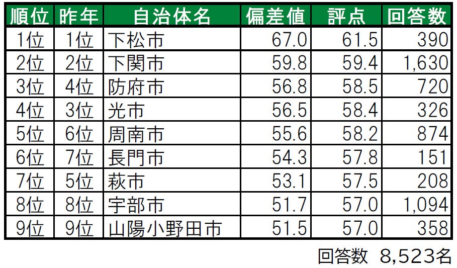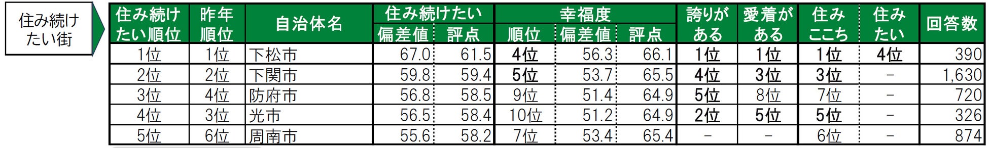 住み続けたい街のトップ2は2年連続で、1位下松市、2位下関市。3位防府市。