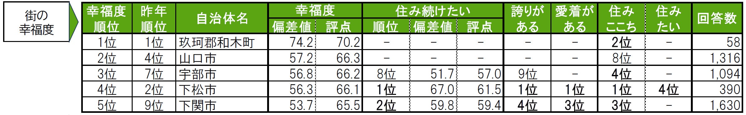 •街の幸福度・住み続けたい街・街に誇りがある・街に愛着があるの順位が「-」と表示されているのは、偏差値50未満のため「-」と表示しています。