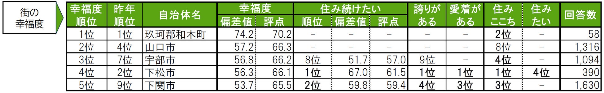 •玖珂郡和木町は、2020年~2024年の累計回答数が自治体が50名未満で、「住み続けたい」「誇りがある」「愛着がある」ランキングの集計対象外となっているため、「-」と表示しています。