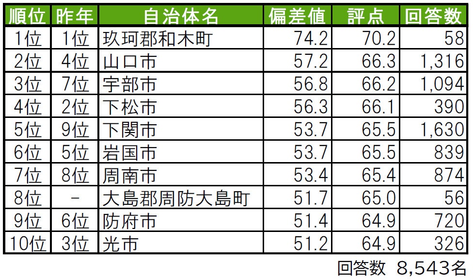 1位は2年連続で玖珂郡和木町で、唯一偏差値70台の高い評価を得ています。2位は山口市(昨年4位)、3位は宇部市(昨年7位)で、いずれも昨年から順位を上げました。その他昨年から順位を上げてトップ10入りしたのは、8位の大島郡周防大島町(おおしまぐん すおうおおしまちょう)(昨年は偏差値50未満のため順位非公開)です。