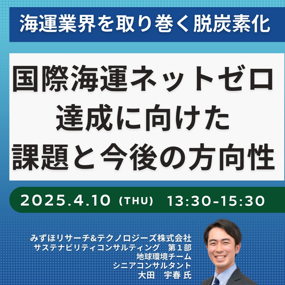 JPI(日本計画研究所)は、みずほリサーチ&テクノロジーズ株式会社 サステナビリティコンサルティング シニアコンサルタント 大田 宇春 氏を招聘し、海運業界の脱炭素化・国際海運ネットゼロ達成に向けた課題と今後の方向性について詳説いただくセミナーを開催します。