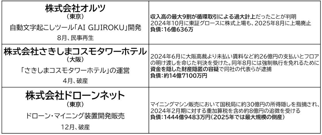 負債額の大きいコンプラ違反倒産においては、最大規模の倒産となったドローンネット(東京都千代田区、負債1444億9483万円)や、収入高の最大9割が循環取引による過大計上だったことが発覚したオルツ(東京都港区、2025年8月再生手続き開始決定)が含まれる。コンプラ違反は巧妙化しており外部から見抜くことが難しいケースが多いことに加えて、複数の金融関係者は「破綻には至っていないが、粉飾などコンプライアンスに抵触する事案は引き続き数多く発生している」と話す。足元ではコンプラ違反倒産は減少傾向にあるが、企業規模を問わず定期的かつ細やかなモニタリングによる与信管理が一層求められているといえよう。