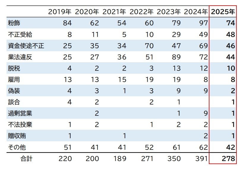 2025年のコンプライアンス違反倒産は278件となり、4年ぶりに減少した。違反類型別では、「粉飾」(74件)が最も多かったなか、「業法違反」「資金使途不正」が3割を超える大幅な減少となった。コンプラ違反が発覚しても倒産に至らなかったケースも多くあり、その手法は巧妙化している。企業規模を問わず、定期的かつ細やかなモニタリングによる与信管理が一層求められている。