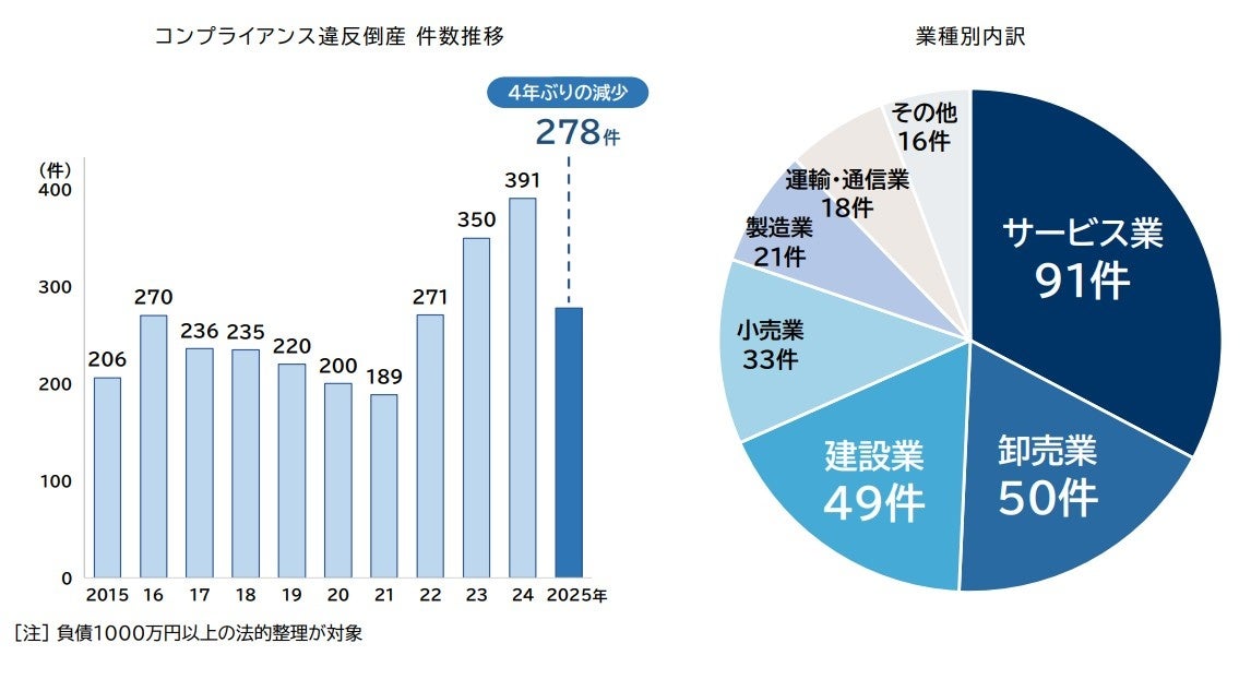 2025年のコンプラ違反倒産は278件、前年から減少